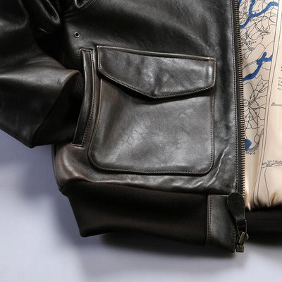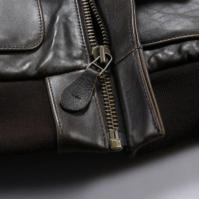 Discover the ultimate A-2 thickened flight jacket—a perfect fusion of history and functionality. Made from 1.5mm imported sheepskin from New Zealand, a durable, warm and proud jacket. The jacket is equipped with practical and stylish oil-waxed Sheepskin pocket,Both beautiful and practical. High quality copper zipper adds a touch of elegance and functionality to the design, ensuring smooth and reliable closure. • Crafted from durable New Zealand sheepskin leather • New Zealand Crafted from premium sheepskin leather.