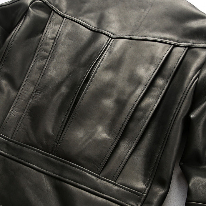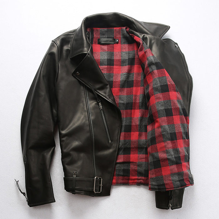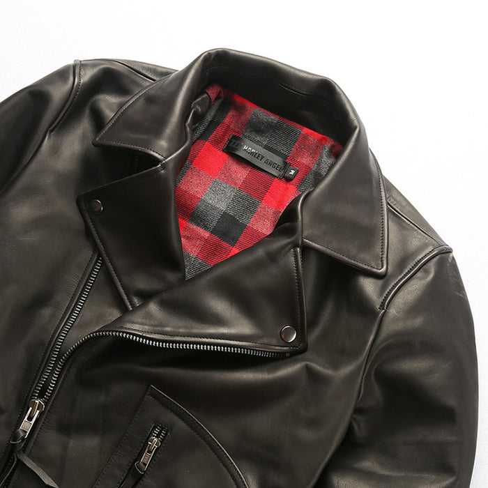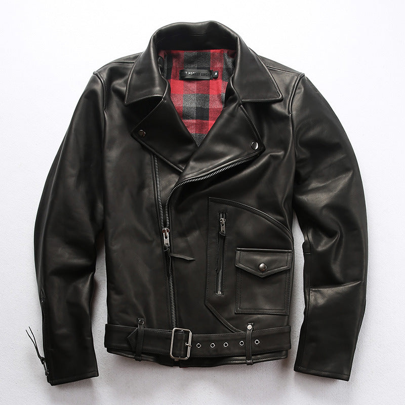Italian Crazy Horse Leather Motorcycle Jacket: A Symbol of Freedom and Power Combining the boldness of Japanese street style with the classic appeal of motorcycle gear, this jacket offers the perfect blend of fashion and functionality for riders. Made from Italian Crazy Horse leather, this jacket provides unparalleled comfort and durability. The leather is soft, smooth, and water-resistant, and over time, it develops a unique, glossy patina that adds a vintage charm. Crafted from premium Cowhide leather with a thickness of 2.0 mm, this jacket showcases the leather’s durability and natural thickness. Built to last, it offers a solid, reliable feel and a timeless look. Comfortable and warm, it’s versatile for all seasons, offering enduring style. The jacket is lined with 100% pure cotton, providing excellent breathability and comfort. The classic checkered pattern adds a retro touch, perfectly complementing the jacket’s exterior. Crafted with a slim fit, this jacket features striking metal details like shoulder straps,paired with asymmetrical zippers for a bold, modern style. Selected waterproof leather treated with an oil-wax finish enhances water resistance while adding a natural sheen and vintage appeal, making this jacket suitable for all-weather use. • Crafted with Premium Leather from Italian • Crafted from high-quality cowhideleather
