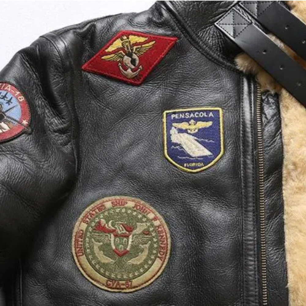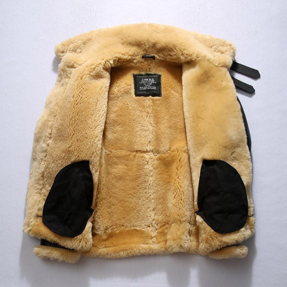 Elevate your winter style with the Men's B3 Bomber Sheepskin Shearling Jacket in sleek black. Crafted from premium Australian sheepskin shearling, this jacket weighs over 3 kilograms, offering unmatched warmth and durability for extreme cold weather. Selected using thickened lambskin from the United States, with a leather thickness of 3mm and a fur length of 20mm, this is a top-grade A-level leather embryo. You deserve to own it. The design of the buckle throat latch will help retain your body temperature even in the coldest season. The coat is use a size 8 Talon brass zipper for durability and ease of use,Make sure the zipper stays smooth for a long time. Each patch on this jacket honors the bravery of those who served, representing a legacy of courage and dedication. Wearing it is like carrying a piece of history, a symbol of strength and resilience. • Crafted with Premium Leather from Australia • Leather thickness: 3mm.