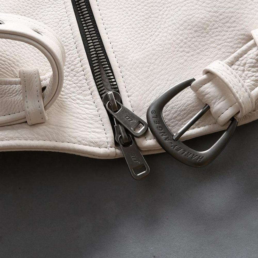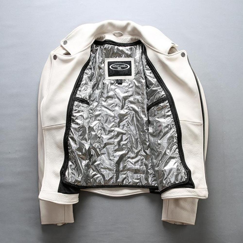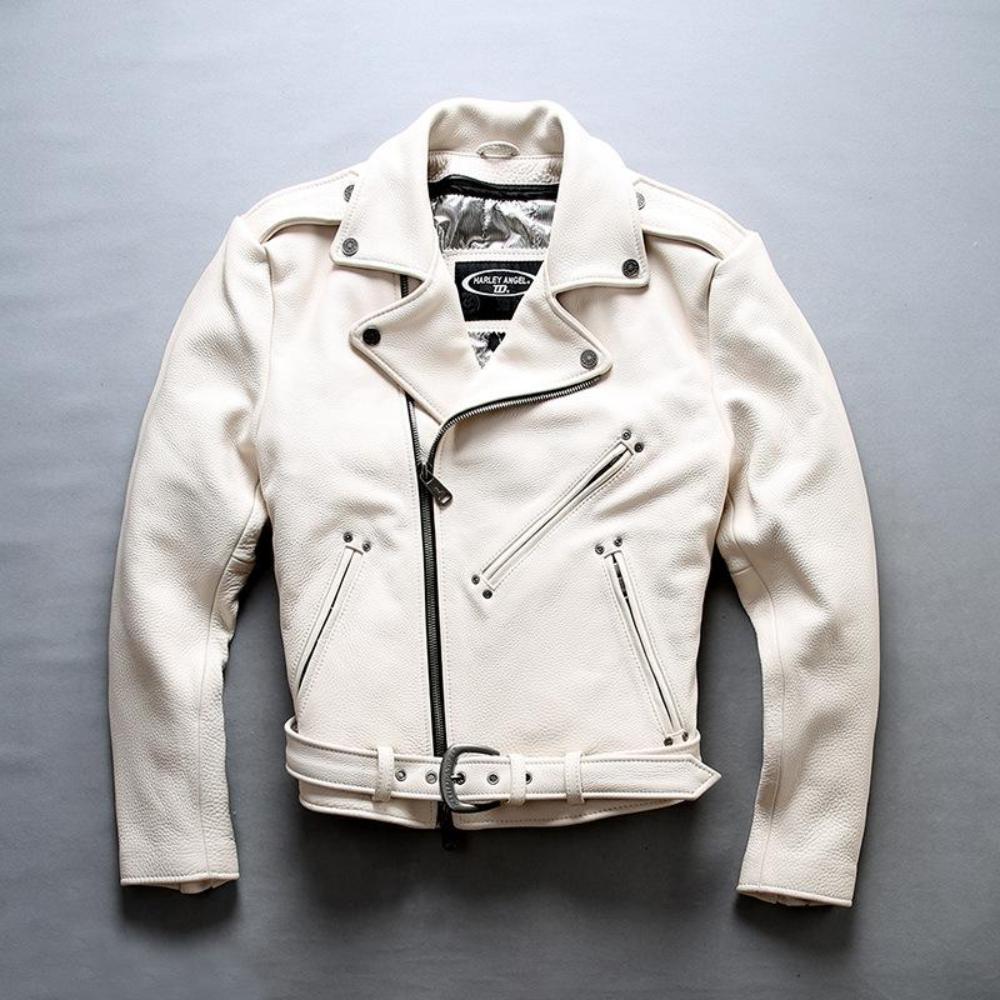 「White Lightning」Motorcycle Leather Jacket U.S. Steerhide: 1.2mm thickness for impact resistance without sacrificing flexibility. UV/radiation protection + moisture-wicking + windproof + thermal insulation. #8 dual zippers for smooth operation in extreme conditions. Asymmetric collar + belted waist for aerodynamic silhouette. • Crafted with Premium Leather from the USA • Crafted from premium cowhide leather