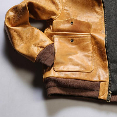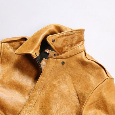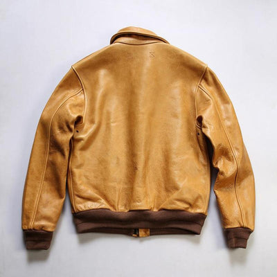 During World War II, the A-2 pilot jacket was not just a signature garment for U.S. Air Force pilots; it was a testament to an era of bravery. Each pilot, protected by this jacket, faced the skies with courage and determination. Today, we honor this legacy with the launch of the Ginger Yellow Thickened Genuine Leather A-2 Jacket. Made from high-quality top-grain cowhide leather, this jacket offers a luxurious feel and exceptional durability. Made from high-quality top-grain cowhide leather, the leather is 1.4 mm thick, giving this jacket a luxurious and textured feel. The jacket is equipped with practical and stylish oil-waxed pockets, adding convenience and a touch of sophistication. • Crafted from premium full-grain cowhide leather • Premium Top-grain cowhide leather