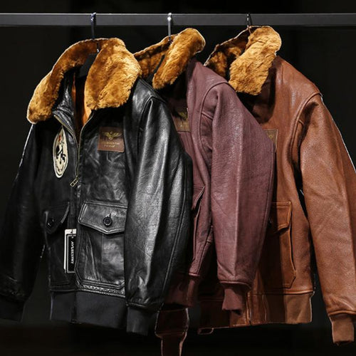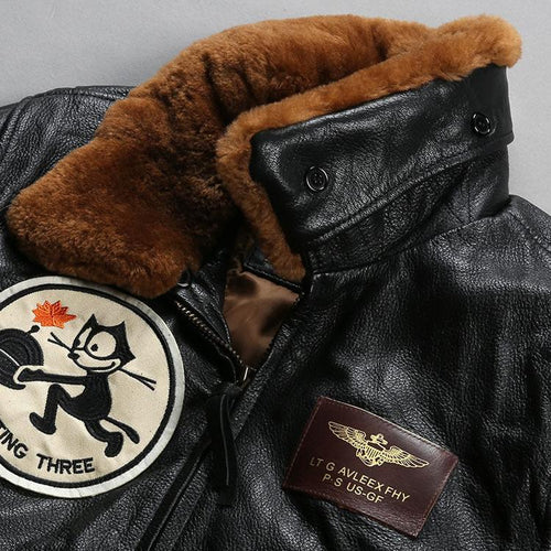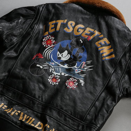 Fili Cat G1 Sea Air Pilot real leather jacket Men's casual wool lead layer cowhide leather coat,collar, adding a touch of luxury and warmth to your style. Showcasing authentic Japanese craftsmanship, the iconic design features embossed animal patterns and printing details, enhancing its unique appeal.