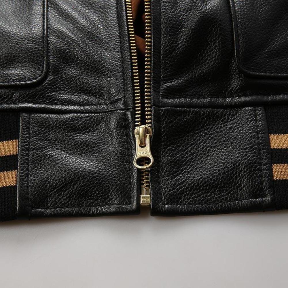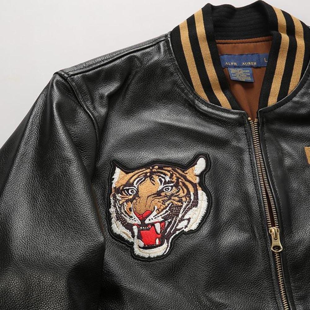 This cowhide varsity jacket redefines classic style with a modern twist. Featuring a bold tiger embroidery on the chest, it symbolizes courage and strength, while intricate back designs honor heritage and artistry. Crafted from premium Cowhide leather with an approximate thickness of 1.3 mm, this jacket highlights the leather’s natural thickness and durability. Built to last, it offers a solid, reliable feel and a clean, timeless look. Comfortable and warm, it’s versatile for all seasons and delivers enduring style. The tiger head embroidery on the right chest is vivid and three-dimensional, showcasing unique artistry and craftsmanship. This embroidery adds a modern touch and distinctiveness to the jacket's classic design. Equipped with a high-quality Japanese YKK zipper, this jacket ensures smooth and reliable operation. The sturdy design provides long-lasting durability and effortless closure, adding a touch of elegance and functionality to the overall look. The premium zipper choice reflects attention to detail and enhances your dressing experience. • Crafted with Premium Leather from Romania • Crafted from high-quality cowhideleather