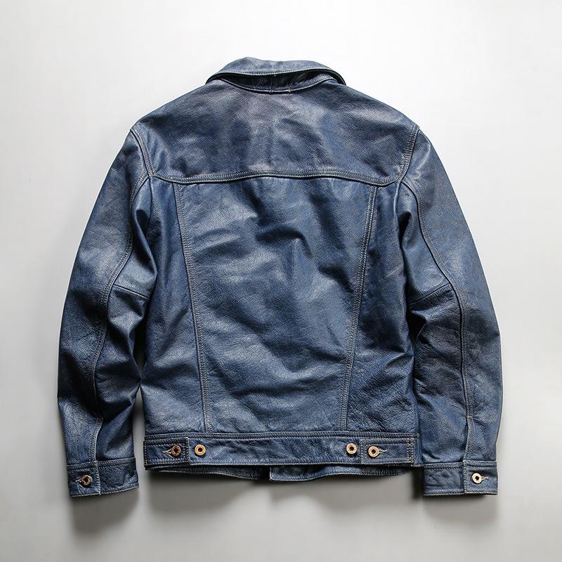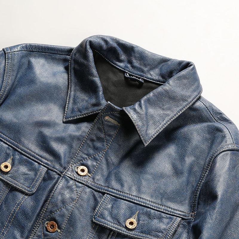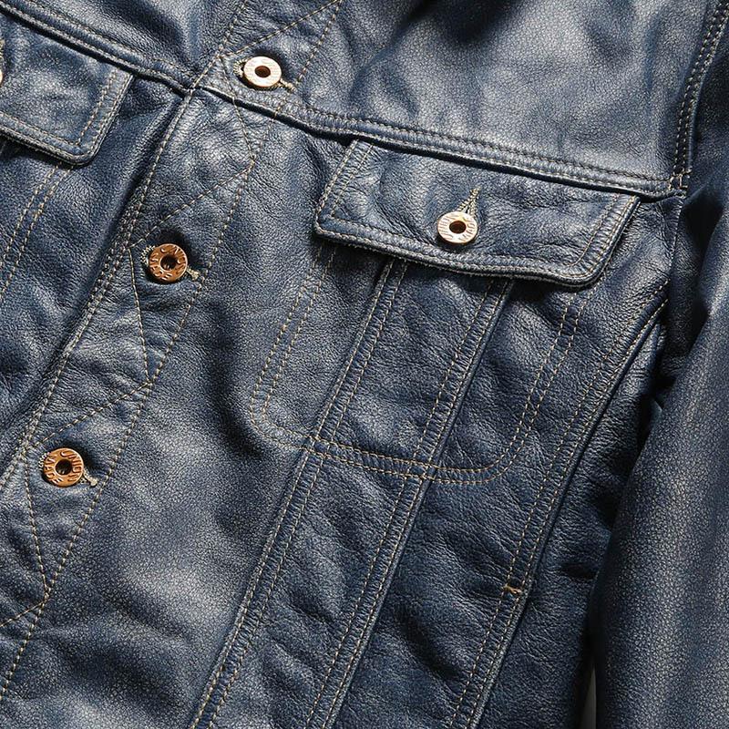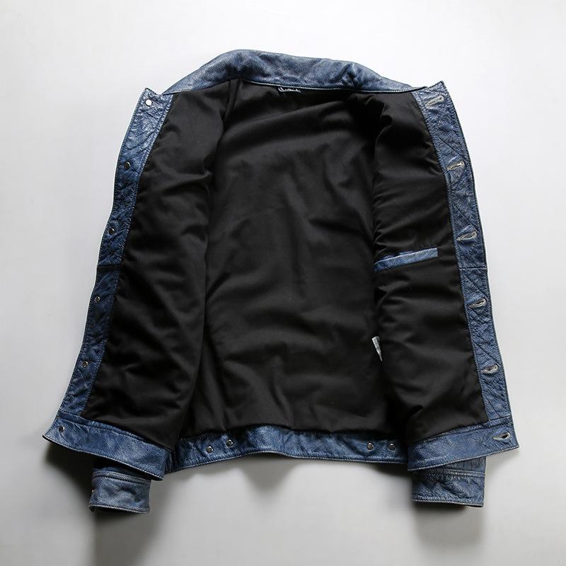 The Vintage Cowboy Leather Jacket is a tribute to the American West, blending rugged workwear heritage with modern style. Crafted from full-grain leather with a unique stonewashed blue finish, it exudes vintage charm and contemporary flair. Perfect for urban streets or outdoor adventures, it’s a timeless piece for the free-spirited. Crafted from premium Cowhide leather with a thickness of 1.1 mm, this jacket showcases the leather’s durability and natural thickness. Built to last, it offers a solid, reliable feel and a timeless look. Comfortable and warm, it’s versatile for all seasons, offering enduring style. The jacket features a heavy-wash treatment, giving it a unique worn-in look with added softness. This distressing process enhances both comfort and character, making each piece one-of-a-kind and ready for everyday wear. This genuine leather jacket combines denim-inspired blue dye with classic leather, offering a stylish and durable fusion. The unique dye process gives it a retro look while maintaining the natural texture of cowhide. The jacket is lined with 100% pure cotton, providing excellent breathability and comfort. The classic checkered pattern adds a retro touch, perfectly complementing the jacket’s exterior. • Full grain • Crafted from high-quality cowhideleather